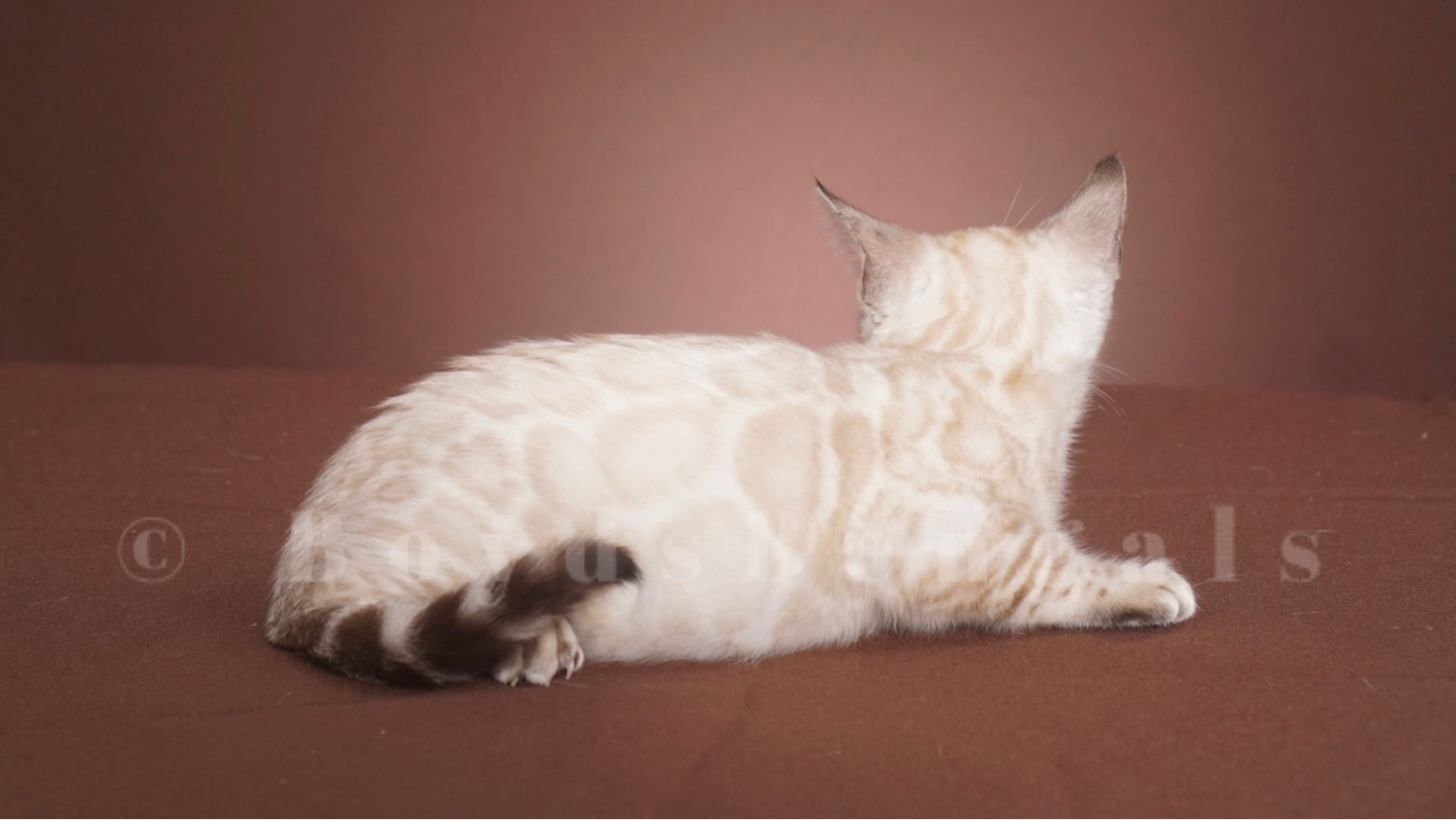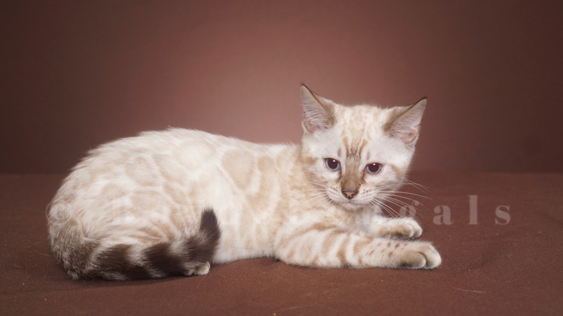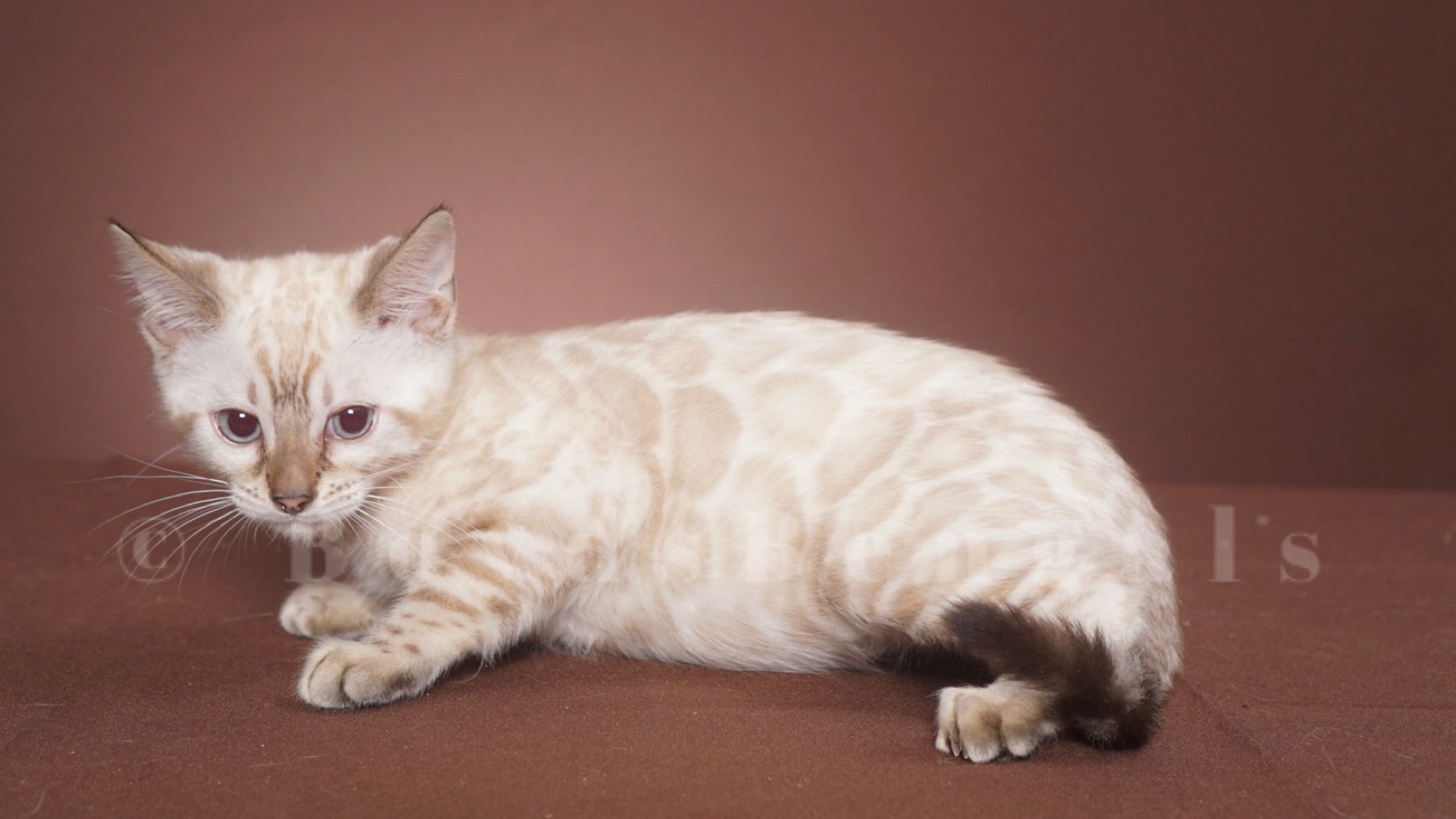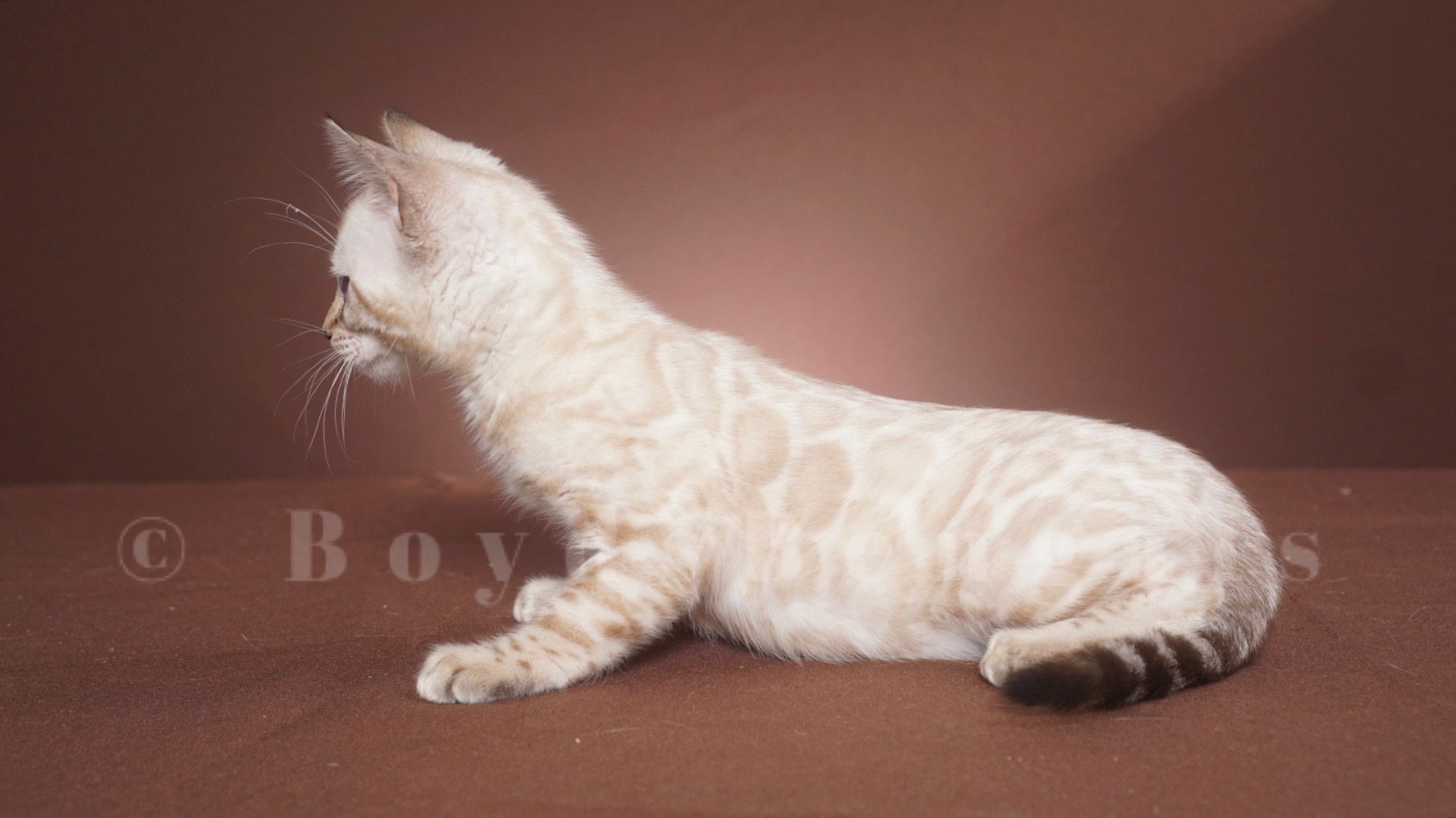 Gorgeous seal lynx boy. He will keep his blue eyes. His rosettes will get darker as he gets older but he will keep his clear white coat. Available as a pet for $4000. Please email us for breeder pricing.