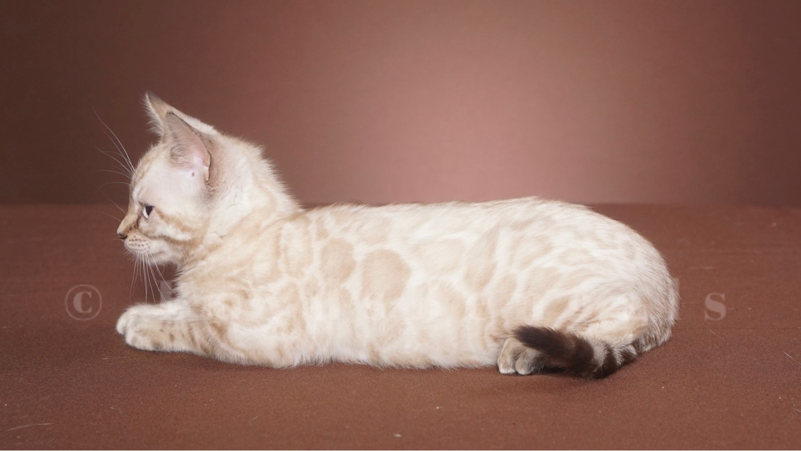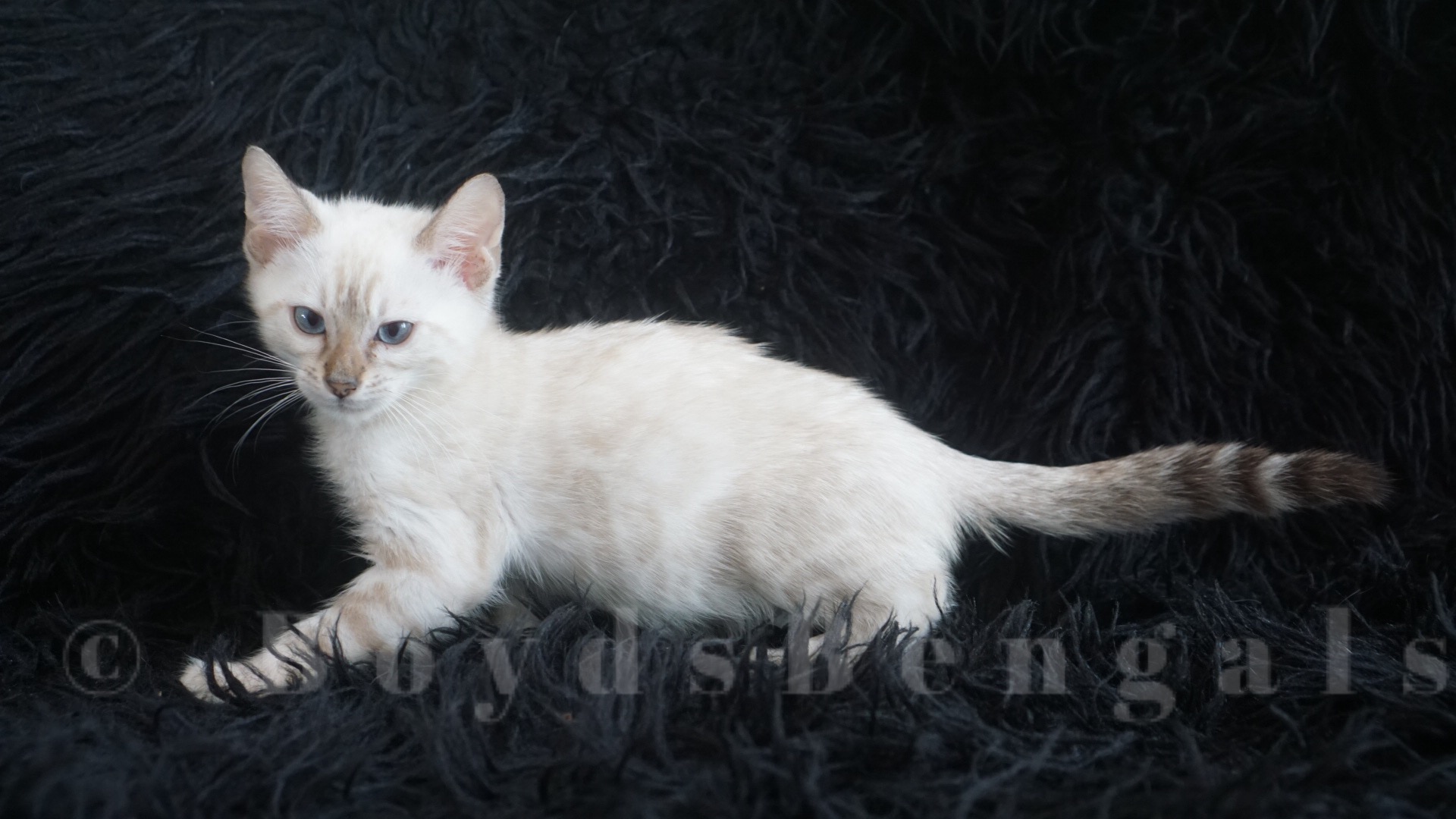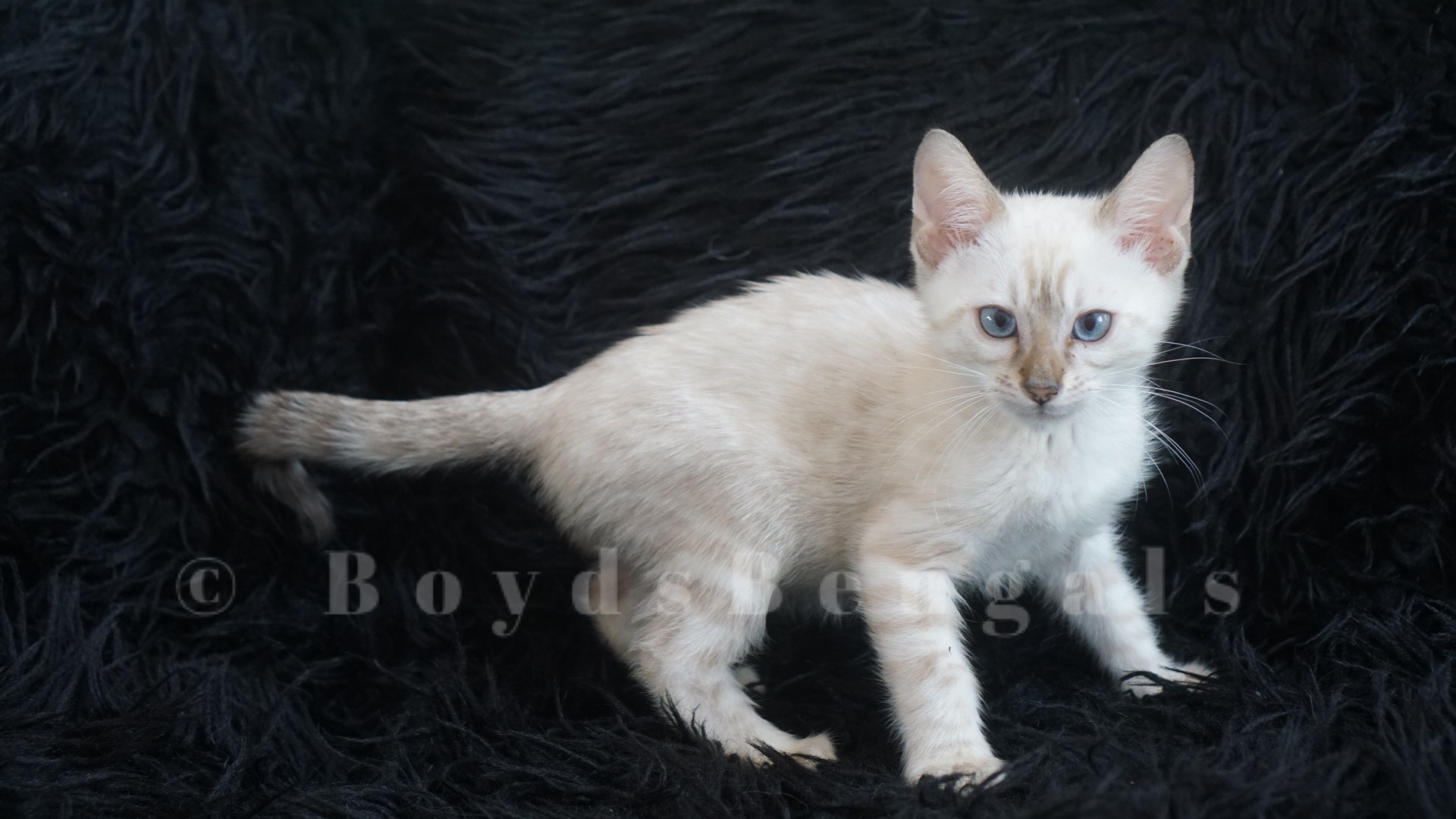 Gorgeous seal lynx boy. He will keep his blue eyes. His rosettes will get darker as he gets older but he will keep his clear white coat. Available as a pet for $4000. Please email us for breeder pricing.