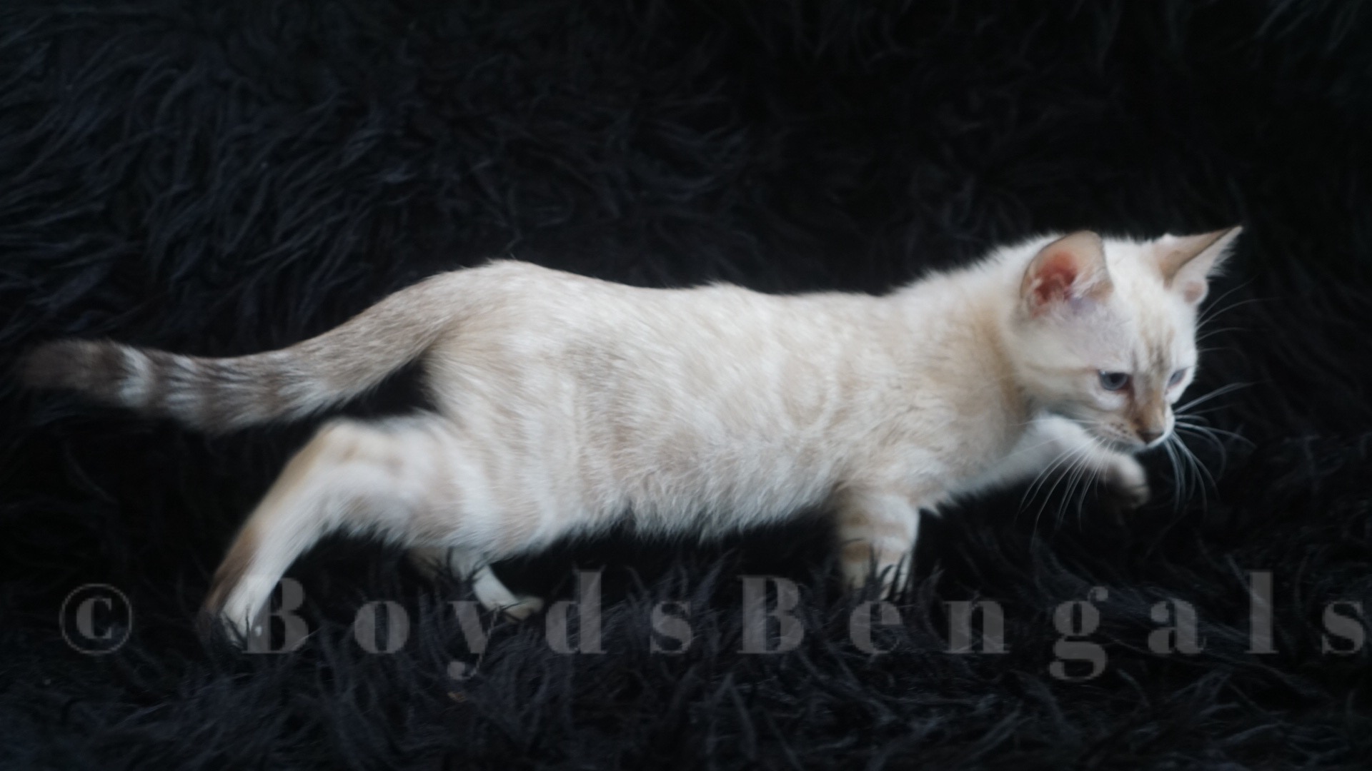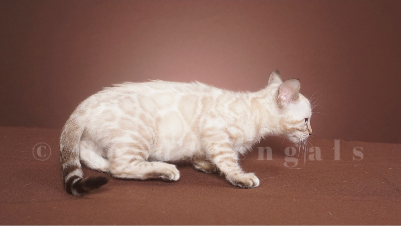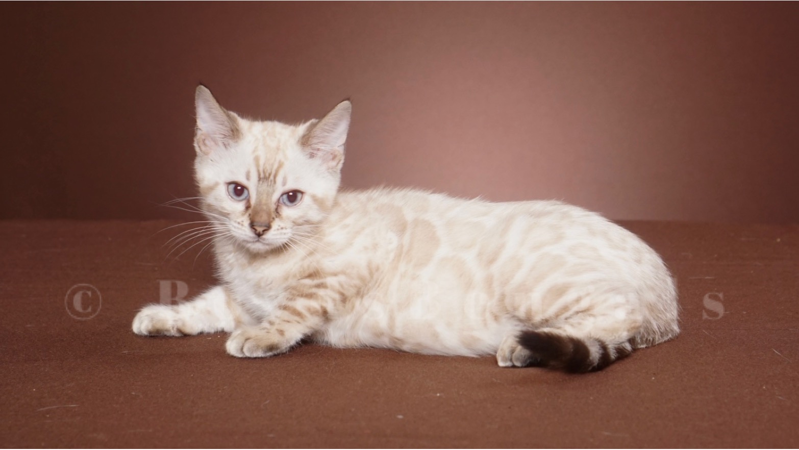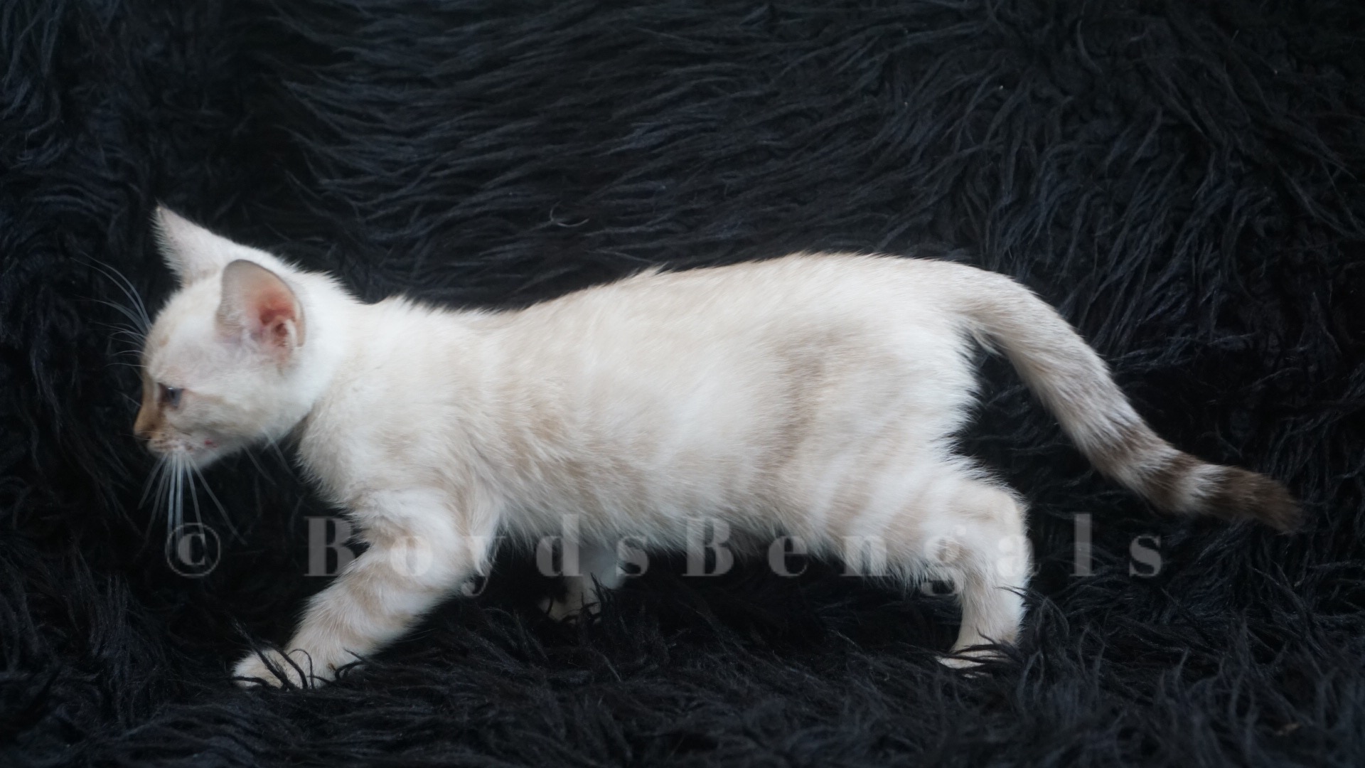Gorgeous seal lynx boy. He will keep his blue eyes. His rosettes will get darker as he gets older but he will keep his clear white coat. Available as a pet for $4000. Please email us for breeder pricing.