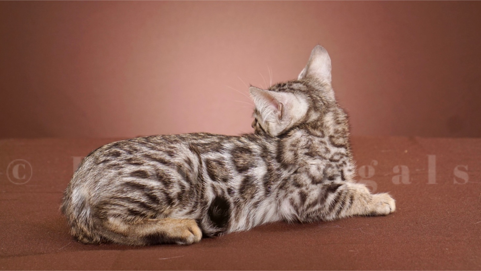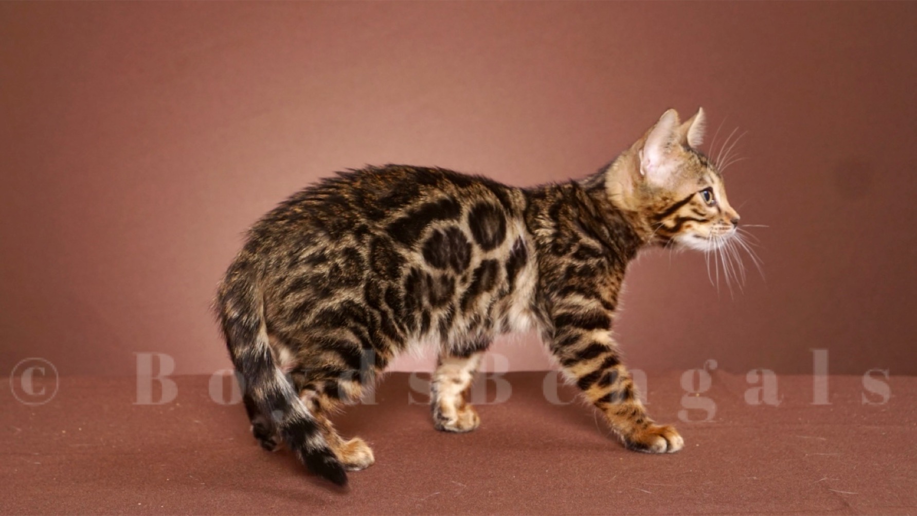 Very sweet, playful and affectionate brown rosetted girl. She has amazing clarity and contrast. Available as a pet for $3000.00.