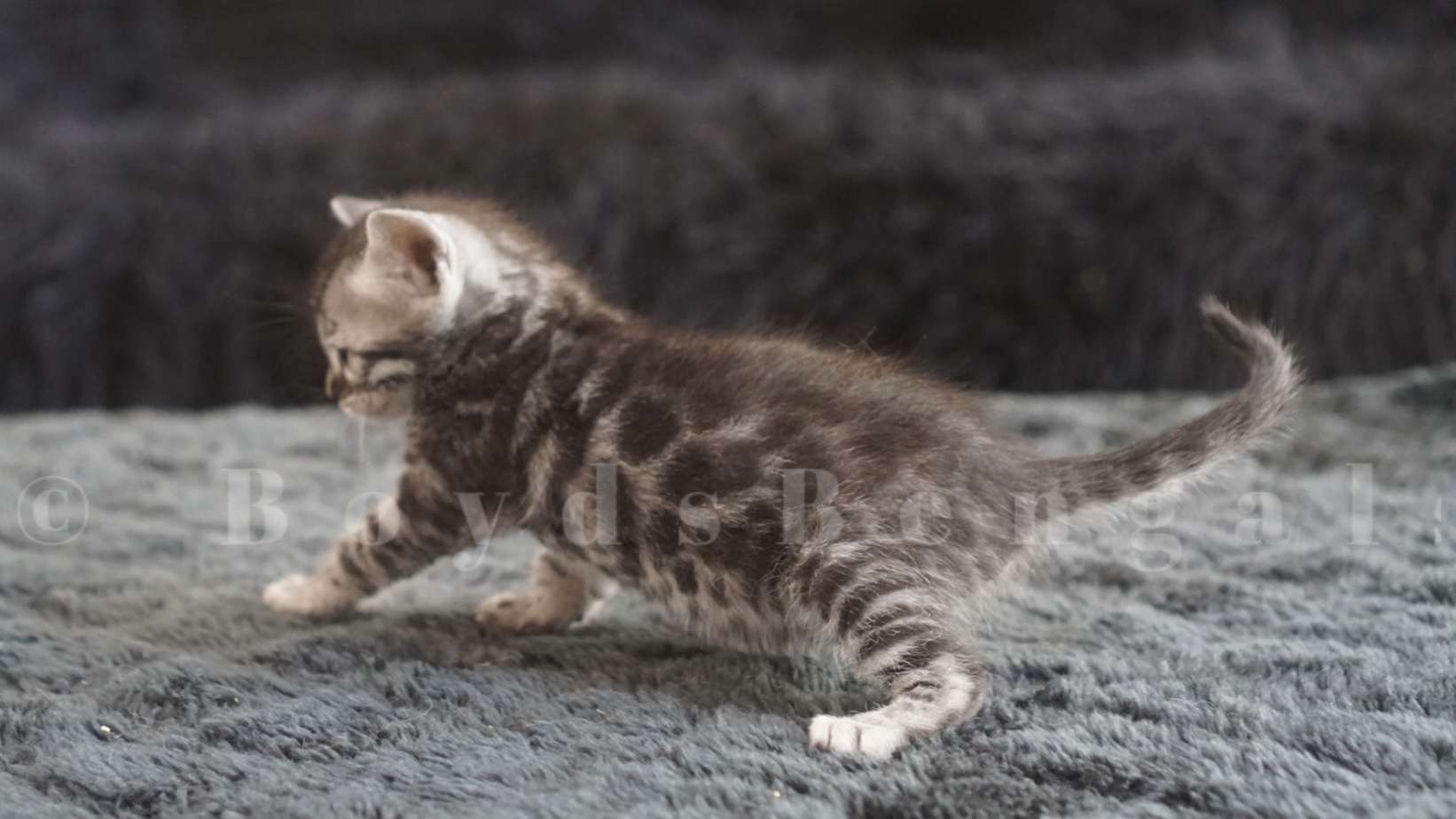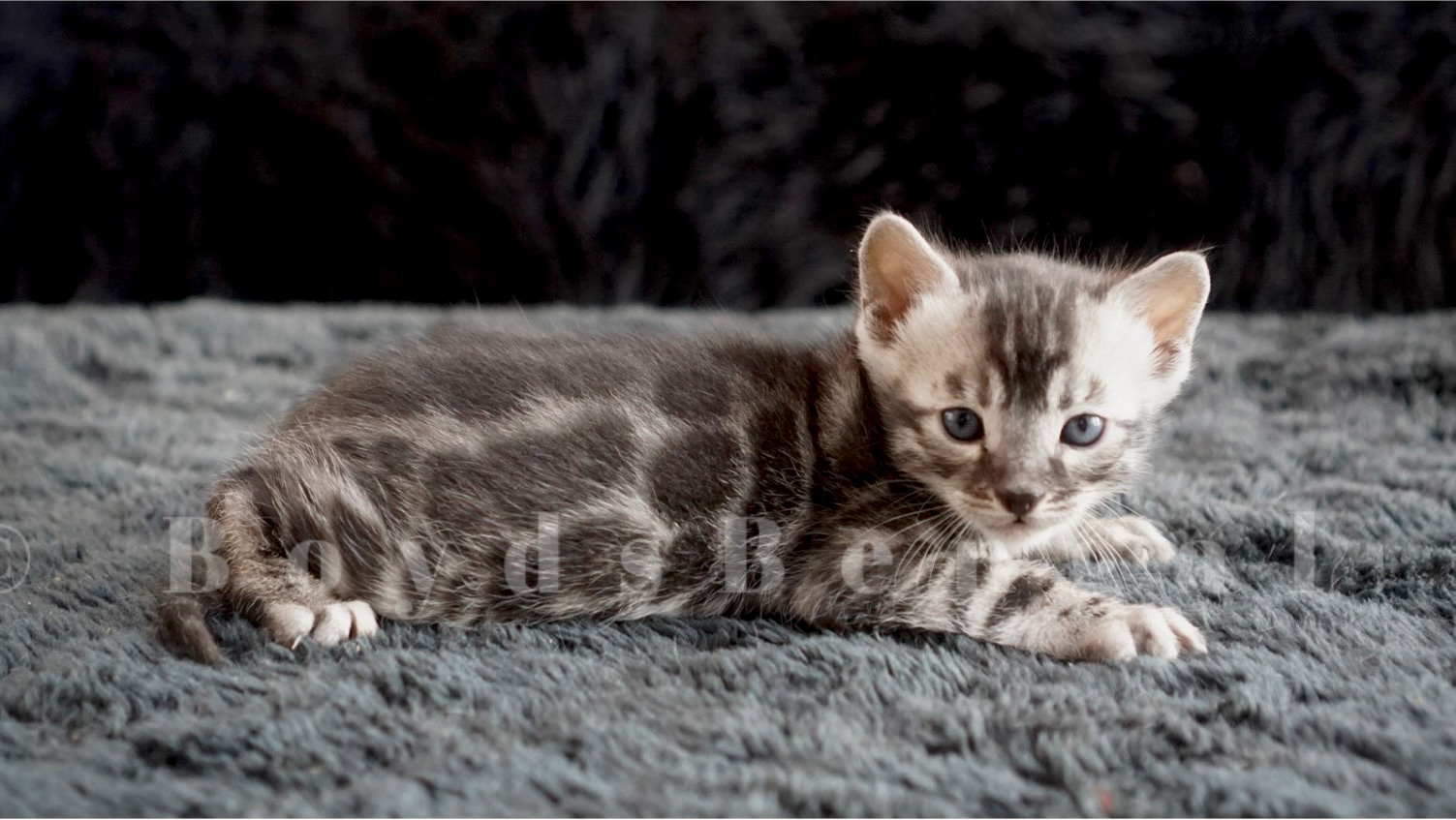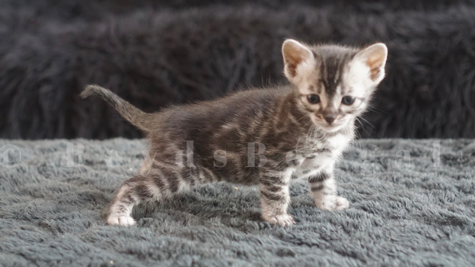 Very special silver charcoal girl. Full younger sister to our show cats GC, NW BoydsBengals Silver Bullet and GC BoydsBengals Silver Storm of Jedha. Love her expressive eyes, her contract and her pattern. Available as a show quality pet for $4500.00.